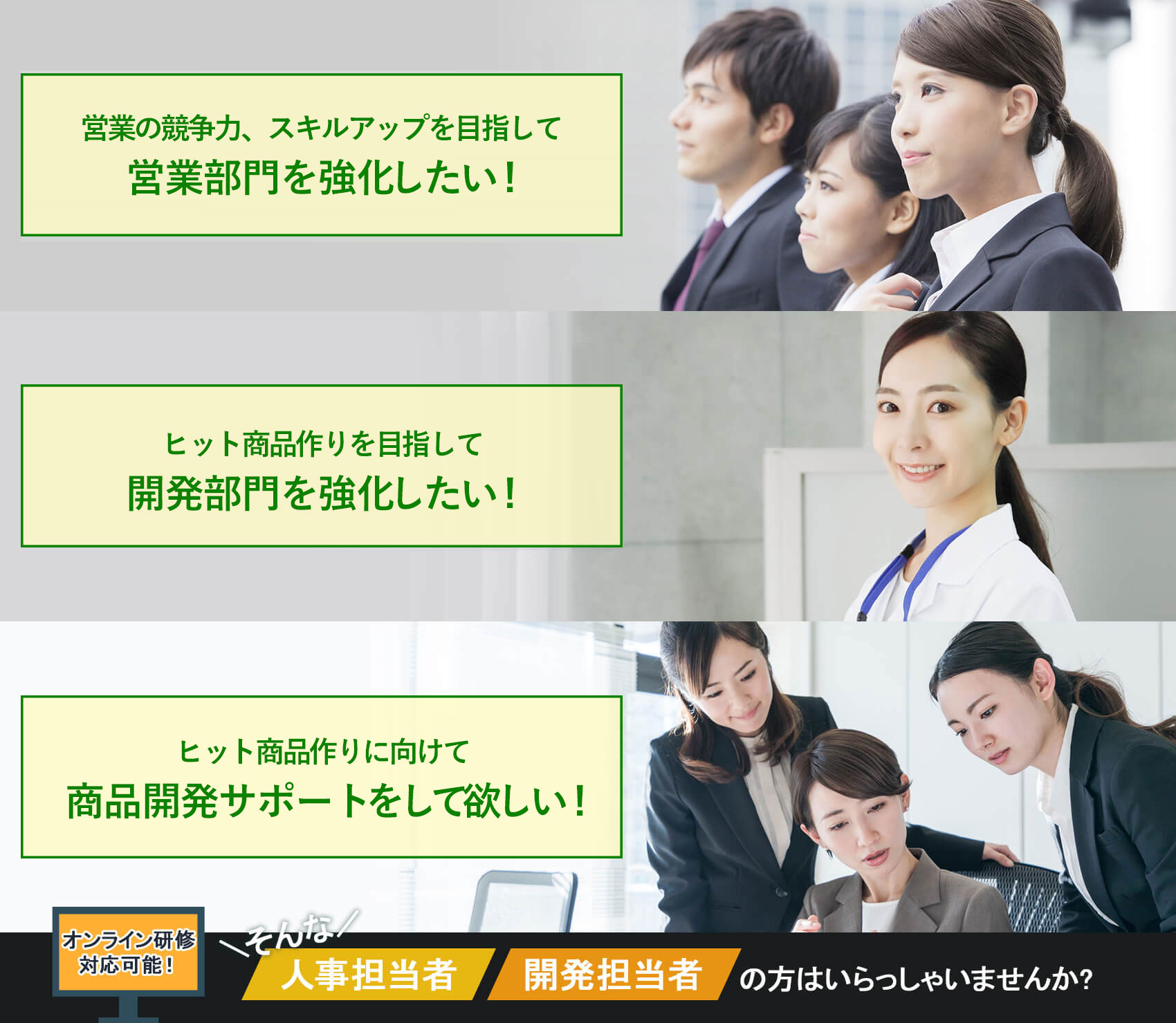 マーケティングの基礎知識を習得し、顧客の購買行動、実態を把握することで、新製品開発にあたっての重要なポイントを理解、様々な商品発想法やコンセプトの作り方などの演習を交えて、ヒット商品作りのポイントやスキルを習得できる研修プログラムです。